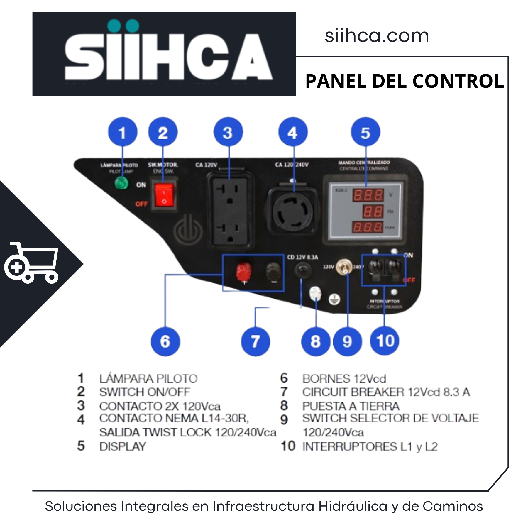 ✅ Versatilidad en conexiones – Cuenta con 1 contacto dúplex 120 VCA (15 A), 1 bornes 12 VDC y 1 salida twist lock NEMA L14-30R 120/240 VCA, brindando compatibilidad con distintos dispositivos.